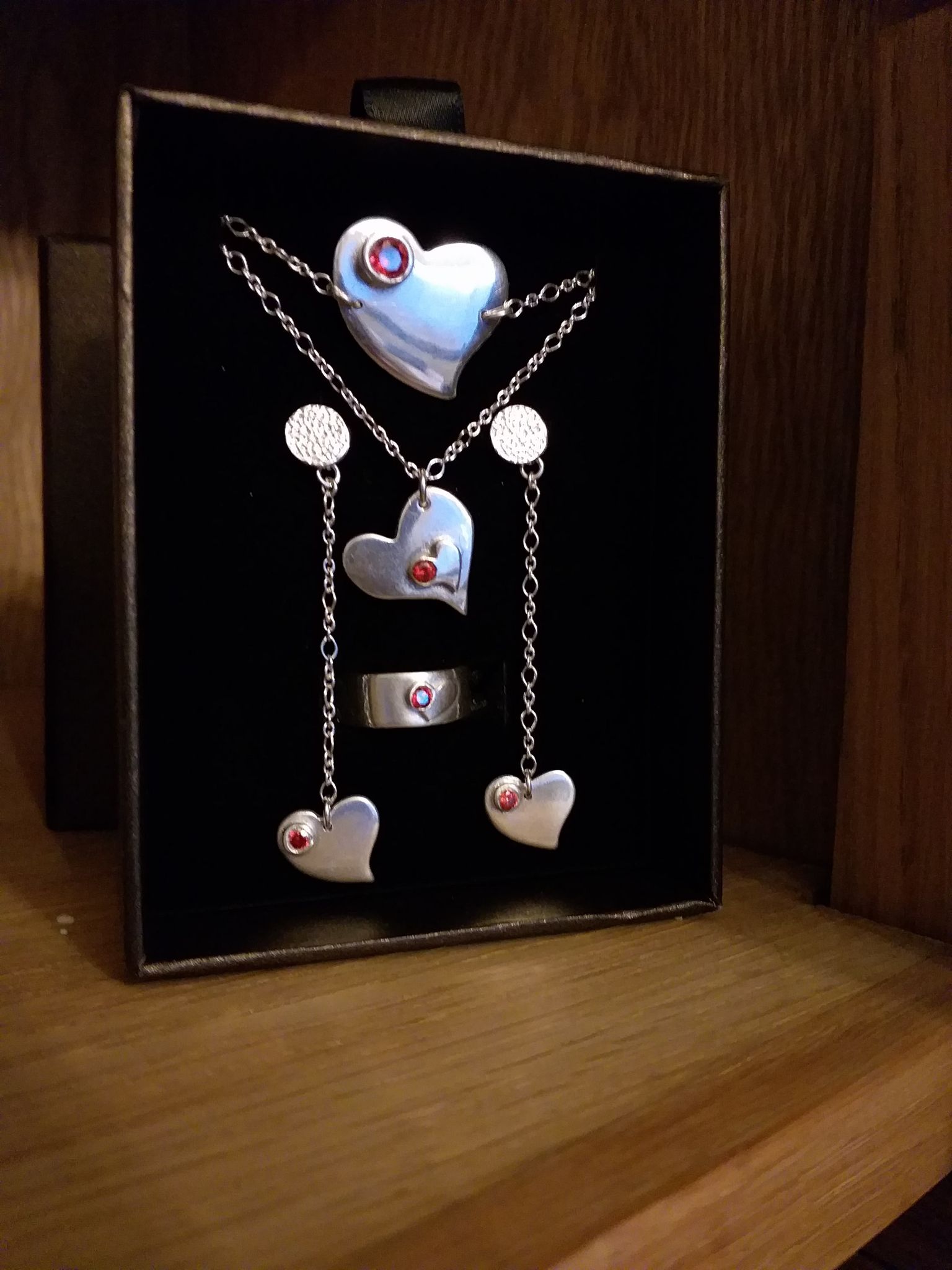 Zuiver zilveren oorbellen, hanger en ring.